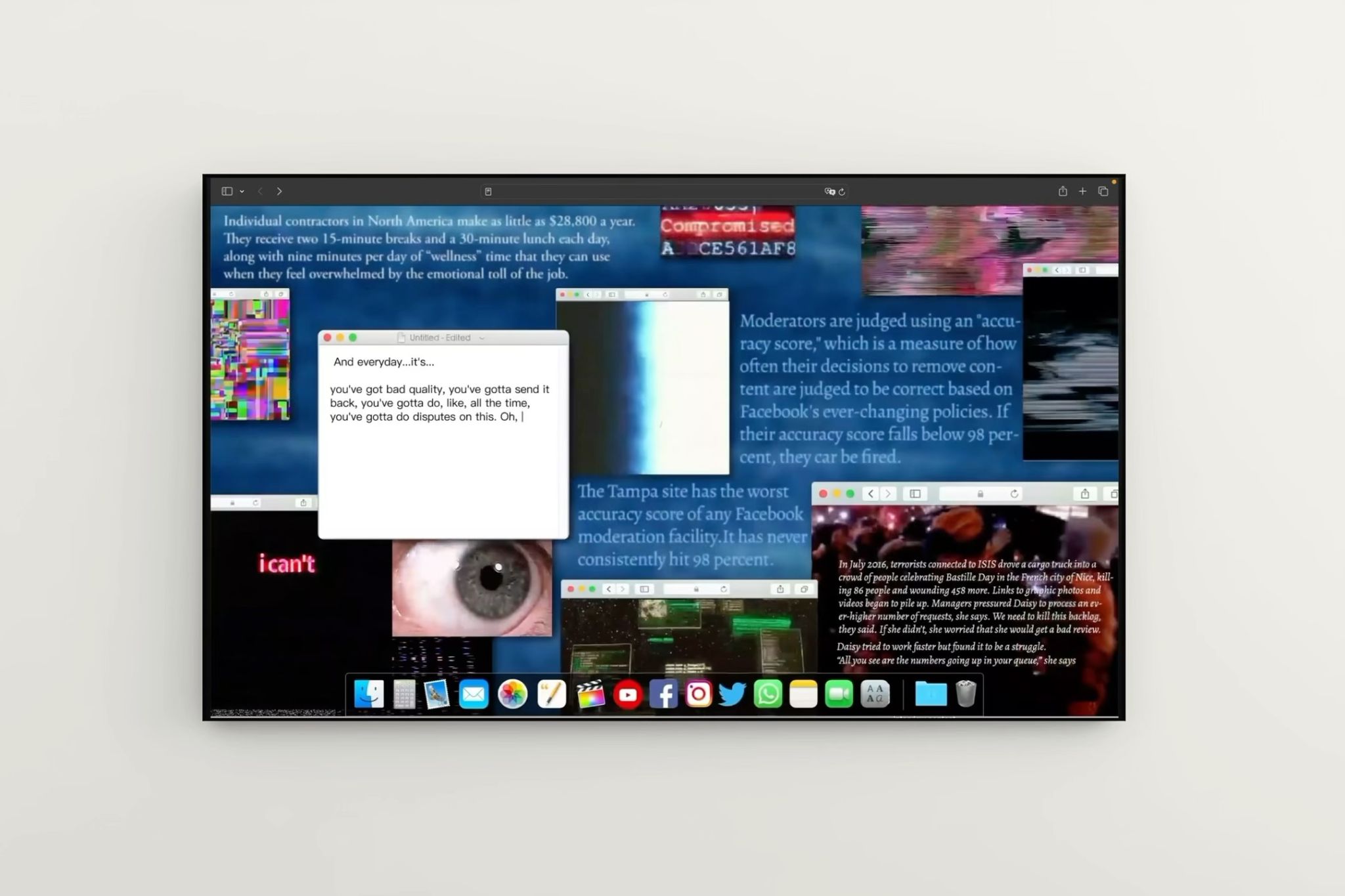 《华尔街日报》曾将内容审核员(Content Moderator)称为“数字时代的创伤处理者”。项目成员基于真实受访者的文本数据进行创作,短片以双重叙事为结构:一方面呈现从业者在面对海量暴力与极端数字内容时的精神困境;另一方面揭示资本驱动下审查体系逐渐异化的逻辑。最终短片在“机械化的内容筛选操作”与“人性化的创伤日志”之间建立起互文关系,邀请观众穿透算法黑箱,在认知暴力与制度规训的共生关系中对当下的互联网内容展开批判性思考。